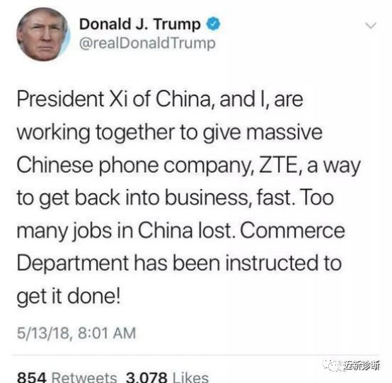 始于4月16日的中兴通讯被美国制裁事件在网络发酵有一段时间了,正当热度逐渐退去之时,事件竟然有了转机。就在5月13日,我们著名的推特总统特朗普在推特上发表了这样的一段话: