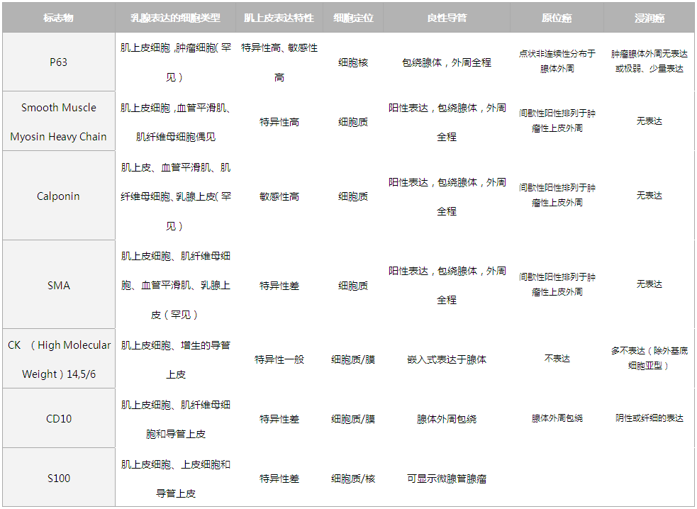 表一、肌上皮细胞标志物在乳腺肿瘤中的表达及作用,即:良性乳腺上皮性肿瘤vs原位癌vs浸润癌