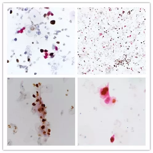 万象城AWC(中国)自主研发的国内首家p16/Ki-67免疫细胞化学双染试剂盒可同时检测出HPV持续感染后过表达的p16和Ki-67。经过染色,在同一个细胞内,细胞核呈棕黄色(Ki-67阳性),细胞浆呈红色(p16阳性),则强烈提示CIN2+病变,需立即进行阴道镜检查;如双染阴性,则提示患癌风险低,可一年后复查。