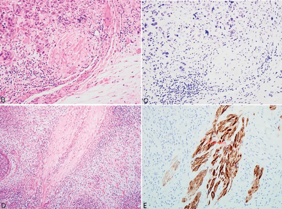 图4B .Smoothelin 在膀胱癌中的应用。尿路上皮癌细胞侵犯平滑肌束;