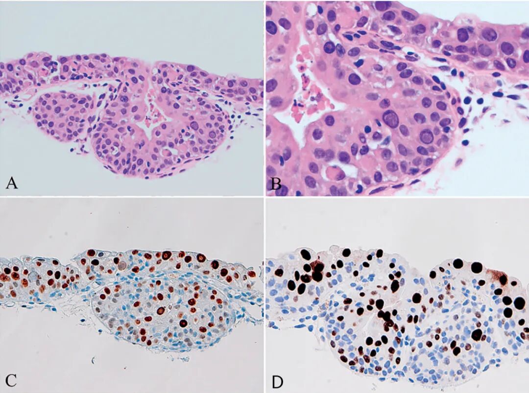 图1C. 膀胱微乳头状尿路上皮癌。p63染色显示基底细胞缺失