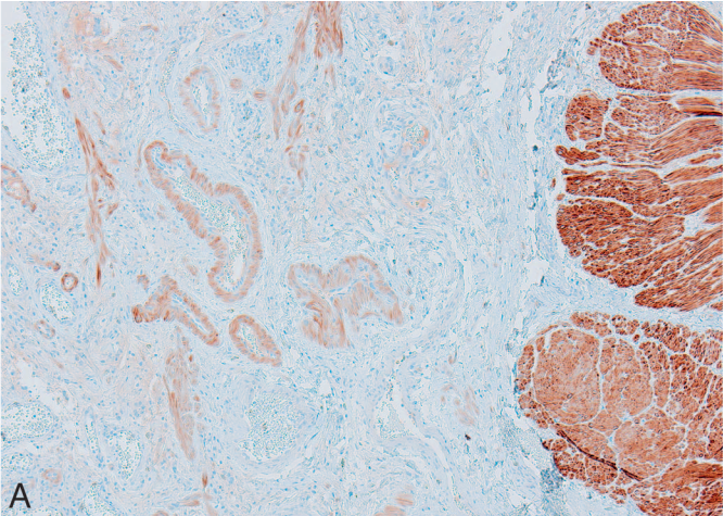 图4A. Smoothelin 在膀胱癌中的应用。Smoothelin 在膀胱癌中的应用。Smoothelin 在固有肌层中呈强阳性(图8A右侧,Smoothelin染色),在黏膜肌层和背景血管中的平滑肌束中为弱阳性(图8A左侧,Smoothelin染色)。