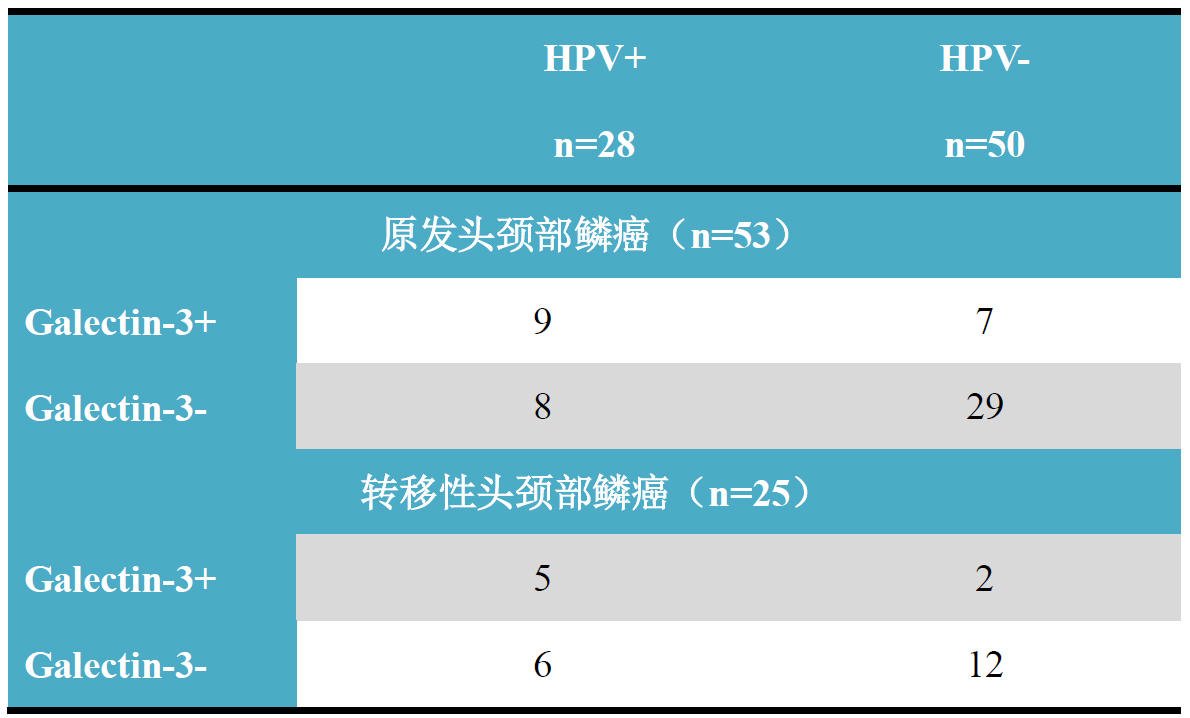 该研究共收集了78例原发及局部淋巴结转移的头颈部鳞状细胞癌病例,制作组织微阵列后顺利获得HR-HPV RNA ISH的方式进行了HPV的评估,同时顺利获得免疫组化的方式对galectin-3的表达进行了评估。结果表明原发头颈部鳞癌中HPV阳性者17例,HPV阴性者36例;转移性头颈部鳞癌中HPV阳性者11例,阴性者14例。
