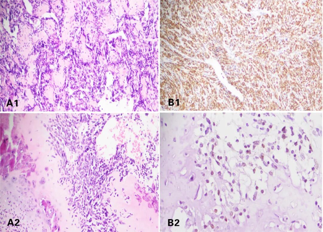 图1,间叶性软骨肉瘤HE染色(A1和A2)与NKX3.1 IHC染色弥漫阳性(B1)和局灶阳性(B2)